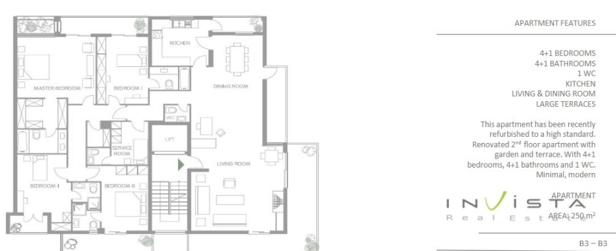 Κάτω Γλυφάδα, διαμέρισμα 250 τ.μ. σε απόσταση 300μ. απο την θάλασσα, στον 2ο όροφο, κατασκευής 2008. Αποτελείται από καθιστικό, κουζίνα, 4 ευρύχωρα υπνοδωμάτια (1 master) , βοηθητικό δωμάτιο, 4 μπάνια και wc. Έχει αυτόνομη θέρμανση με φυσικό αέριο, κλιματιστικά, διπλά τζάμια, δρύινα δάπεδα και πόρτα ασφαλείας. Αποθήκη και υπόγεια θέση στάθμευσης. Επίσης, κοινόχρηστο γυμναστήριο και παιδική χαρά. Βρίσκεται σε φυλασσόμενο συγκρότημα κατοικιών, σε πολύ ωραία διαμορφωμένη περιοχή, κοντά σε συγκοινωνίες - σχολεία - αγορά. Το στίγμα στο χάρτη δείχνει την ευρύτερη περιοχή και οχι την ακριβή διεύθυνση. Τιμή ενοικίασης 4.900 €. Για περισσότερες πληροφορίες για το συγκεκριμένο ακίνητο ή παρόμοια ακίνητα παρακαλώ επικοινωνήστε μαζί μας στα τηλέφωνα 210/9658520 ή επισκεφθείτε την σελίδα μας www.invistarealestate.gr
